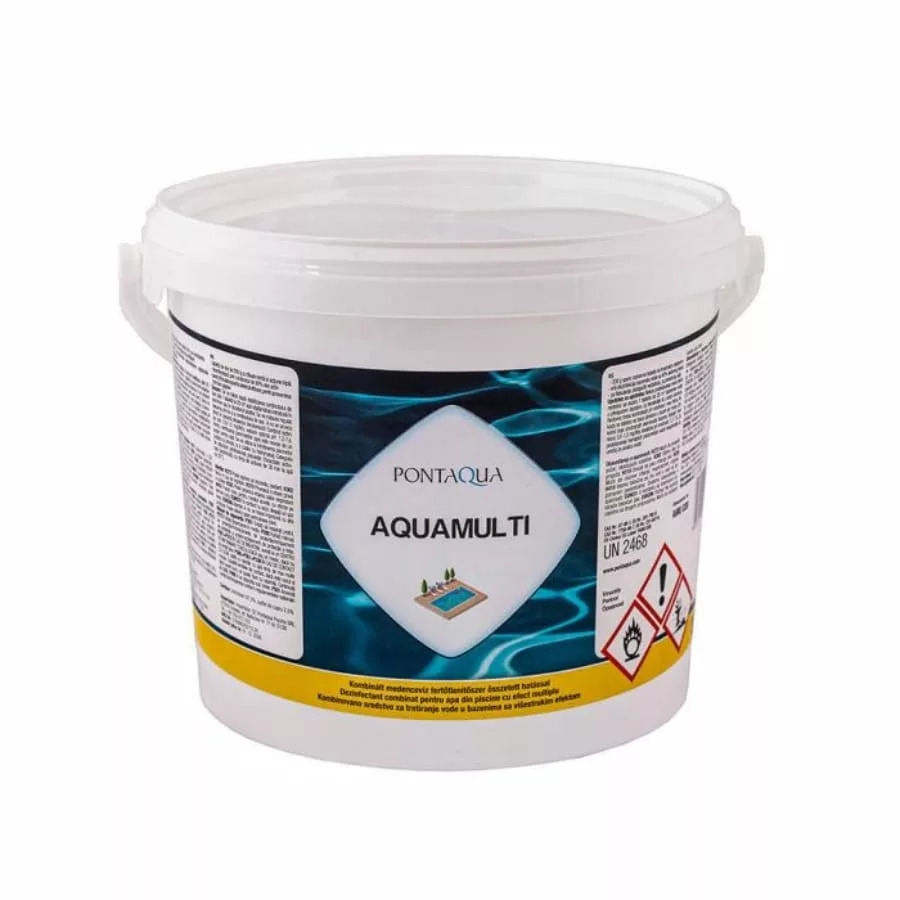 Klórozószert, algaölőt és pelyhesítőszert tartalmazó 200 grammos kombinált tabletta. Lassan oldódik, a medence vízben hosszan fejti ki hatását a baktériumok, gombák és algák ellen. Folyamatos pelyhesítő hatást biztosít. Hatóanyag: triklórizocianursav, réz-szulfát AQUAMULTI 1 kg-3 kg